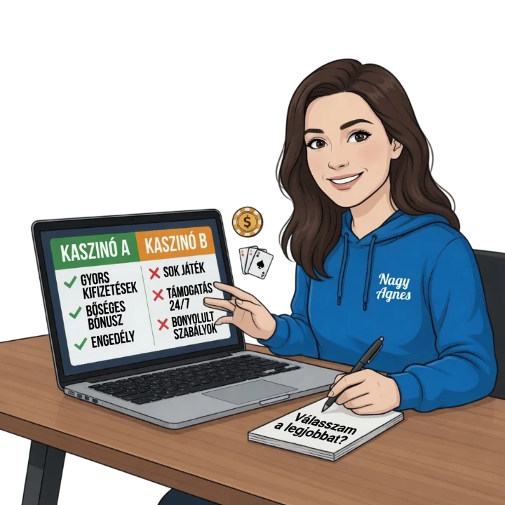 - Magyar nyelvű ügyfélszolgálat. Ha probléma adódik, a nyelvi akadály kritikus. Az összehasonlítóban látod, melyik kaszinó kínál valódi anyanyelvi magyar supportot, és melyiknél csak gépi fordítás van. Egy bónuszvita vagy kifizetési reklamáció esetén ez sokat számít.